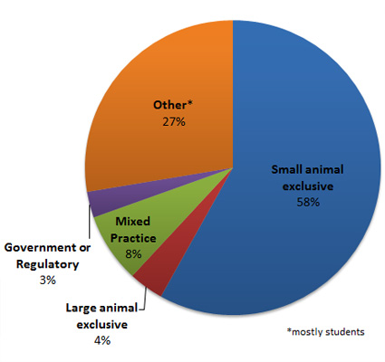 AVMA Convention ReportSeptember 5, 2013 I was fortunate to help staff an HSVMA booth at the American Veterinary Medical Association convention recently in Chicago. It was a great opportunity for us to meet with our membership, solicit new members, and ask some interesting questions of the veterinary professionals in attendance. We really feel strongly that HSVMA is an organization that should represent its members, their desire to address animal welfare issues, and philosophy on how best to do so. I would like to share what the attendees told us by means of a short survey. What is your predominant professional work category?