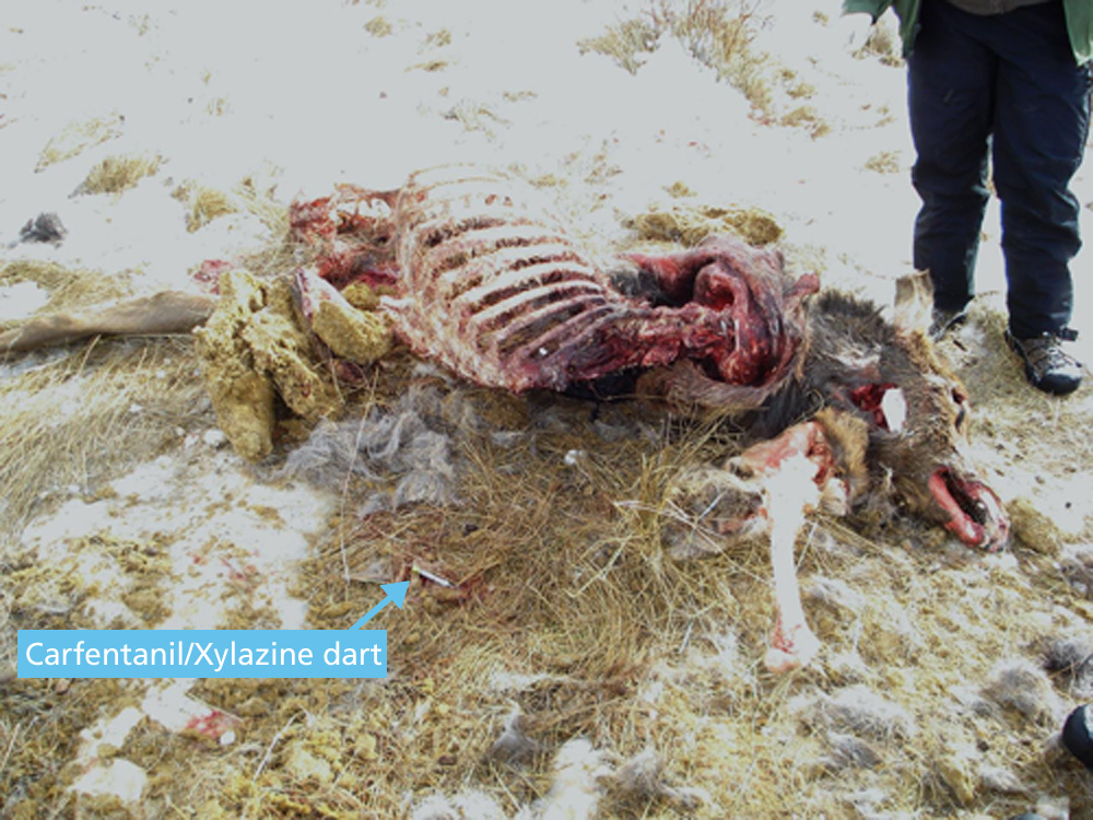 If you happened to be driving up the road alongside Moraine Park in Rocky Mountain National Park in December of 2011, as I was, you would have been surprised to first note a coyote, and then a mountain lion, in plain sight in a meadow right next to the road. Shortly after, you would have come upon an elk carcass surrounded by large crimson patches of blood-stained snow. On closer inspection, you would have seen an injectable dart lying next to the carcass, containing remnants of carfentanil and xylazine. You might have become concerned since a few drops of carfentanil could be deadly to a child who might also be exploring the carcass, not to mention the magpie perched on the exposed sternum and the other scavengers and predators observed nearby.